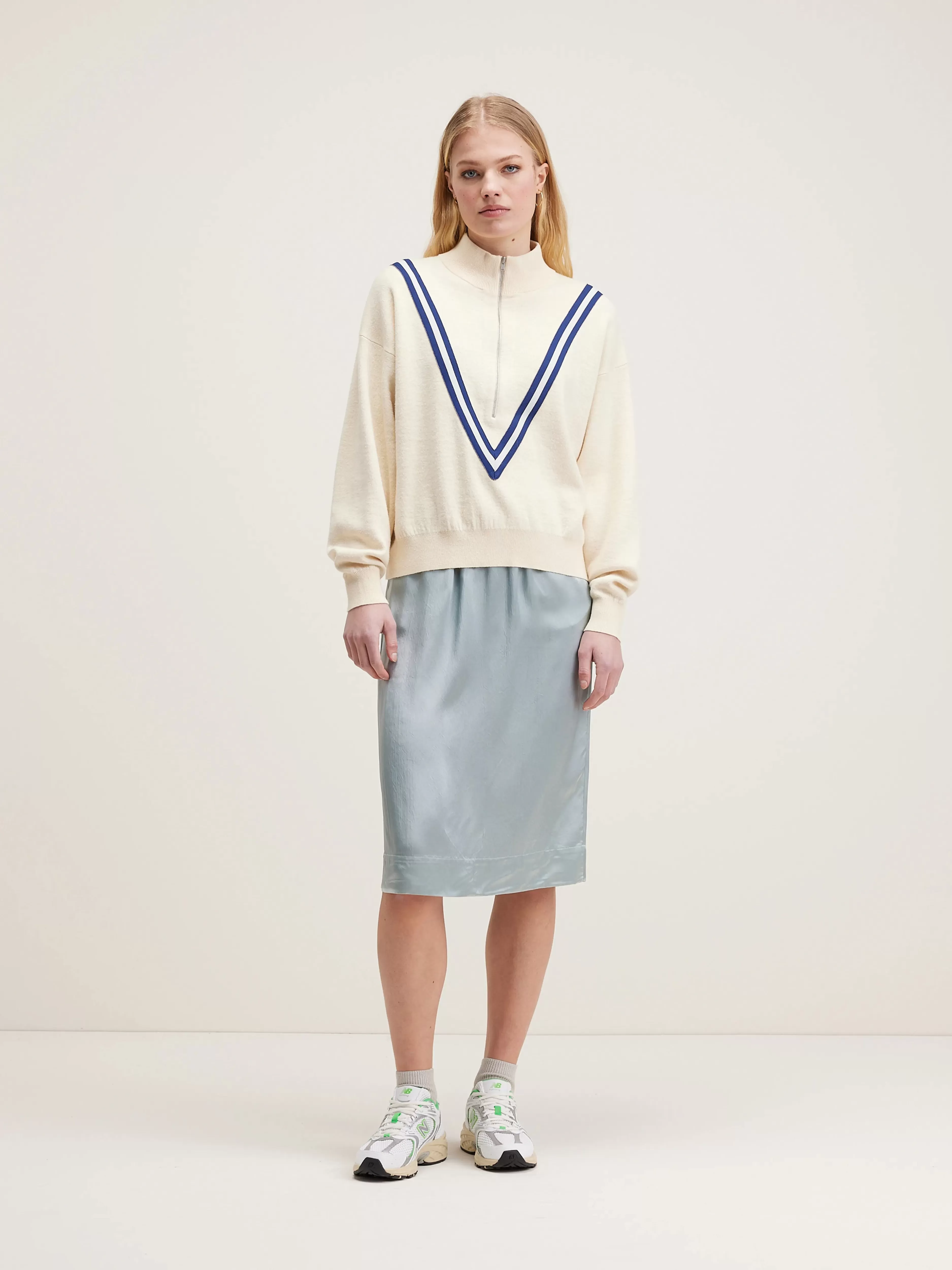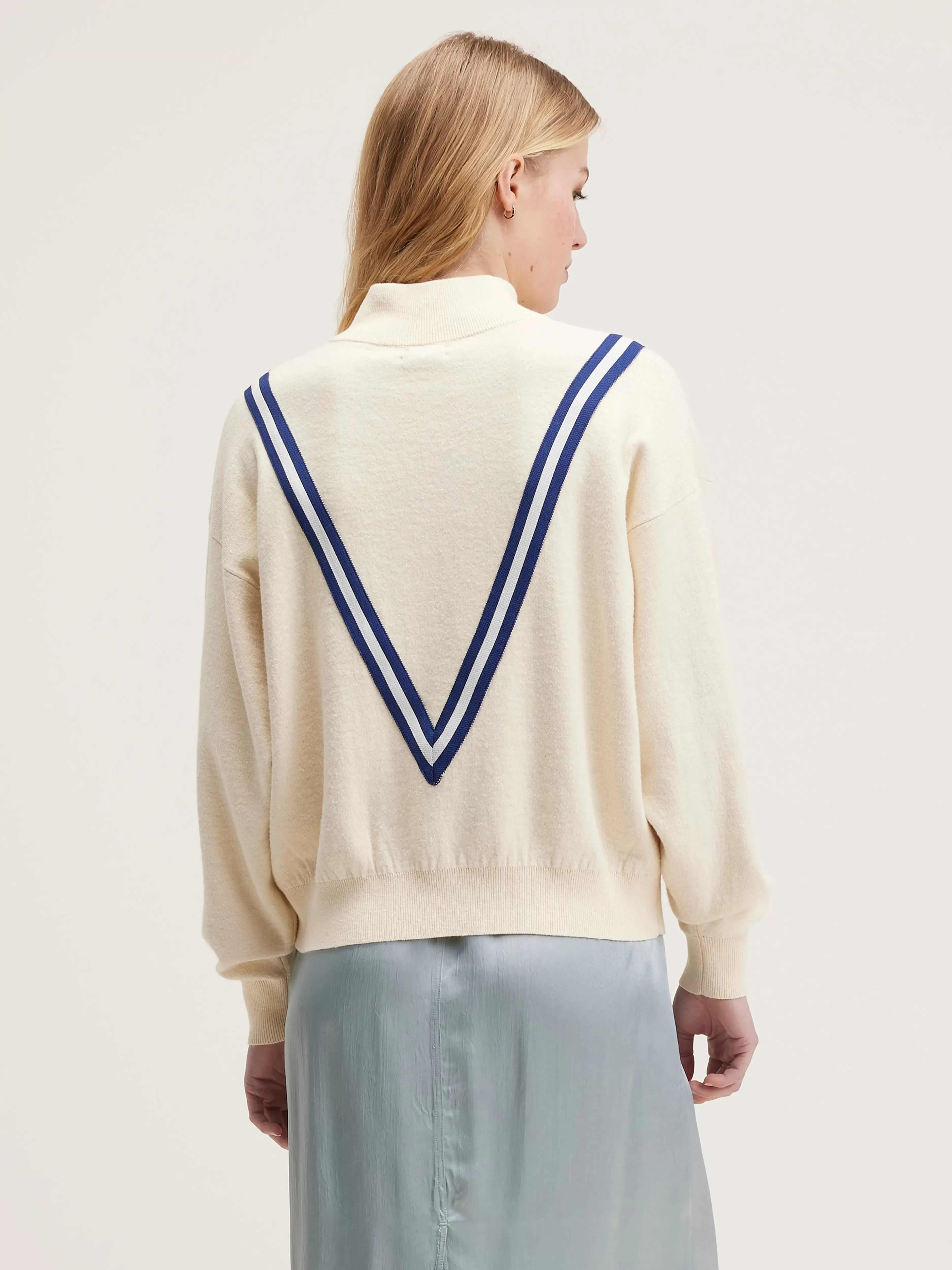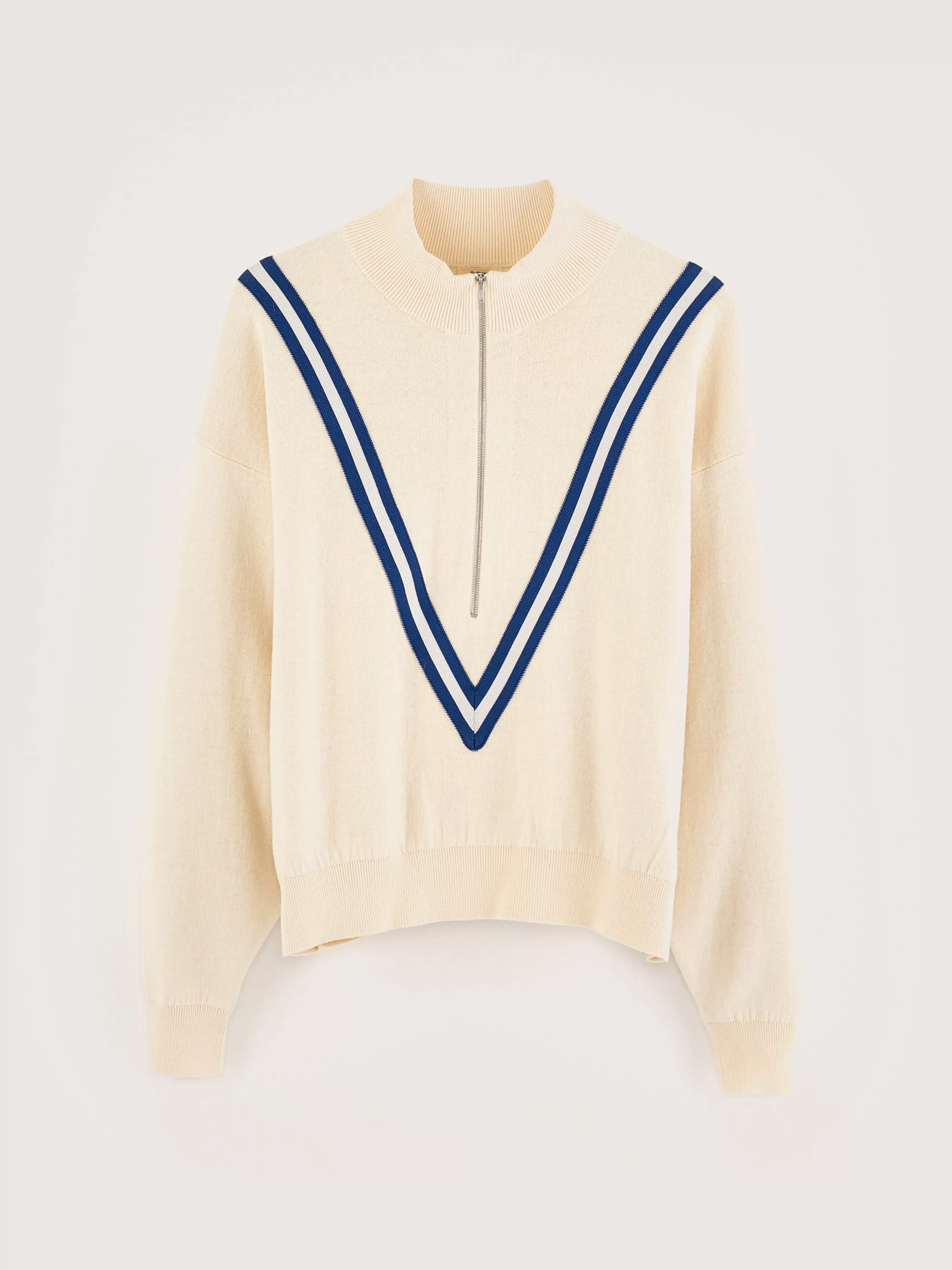 Oversized jumper met ritssluiting vooraan en opstaande kraag, in gebroken wit.