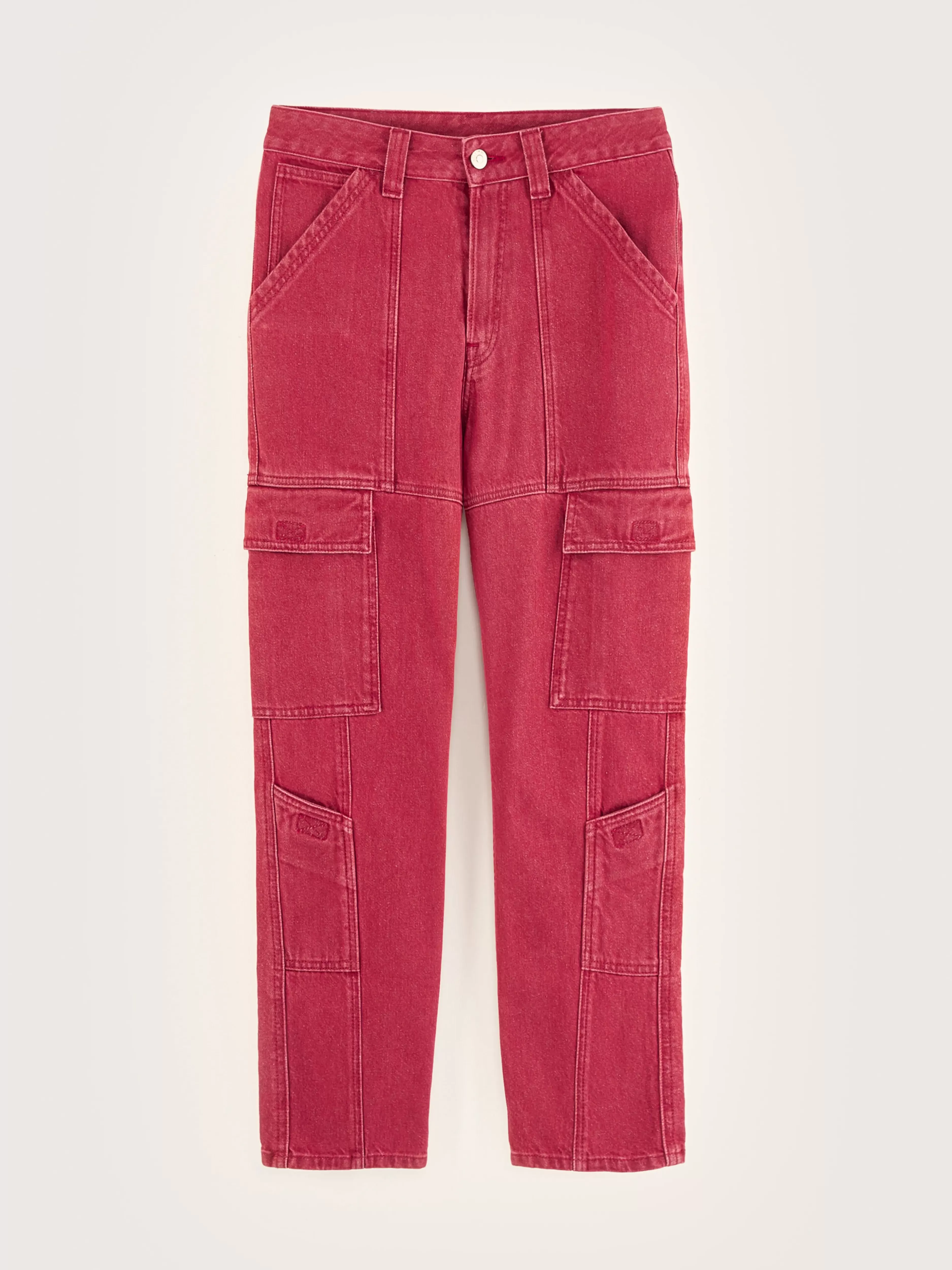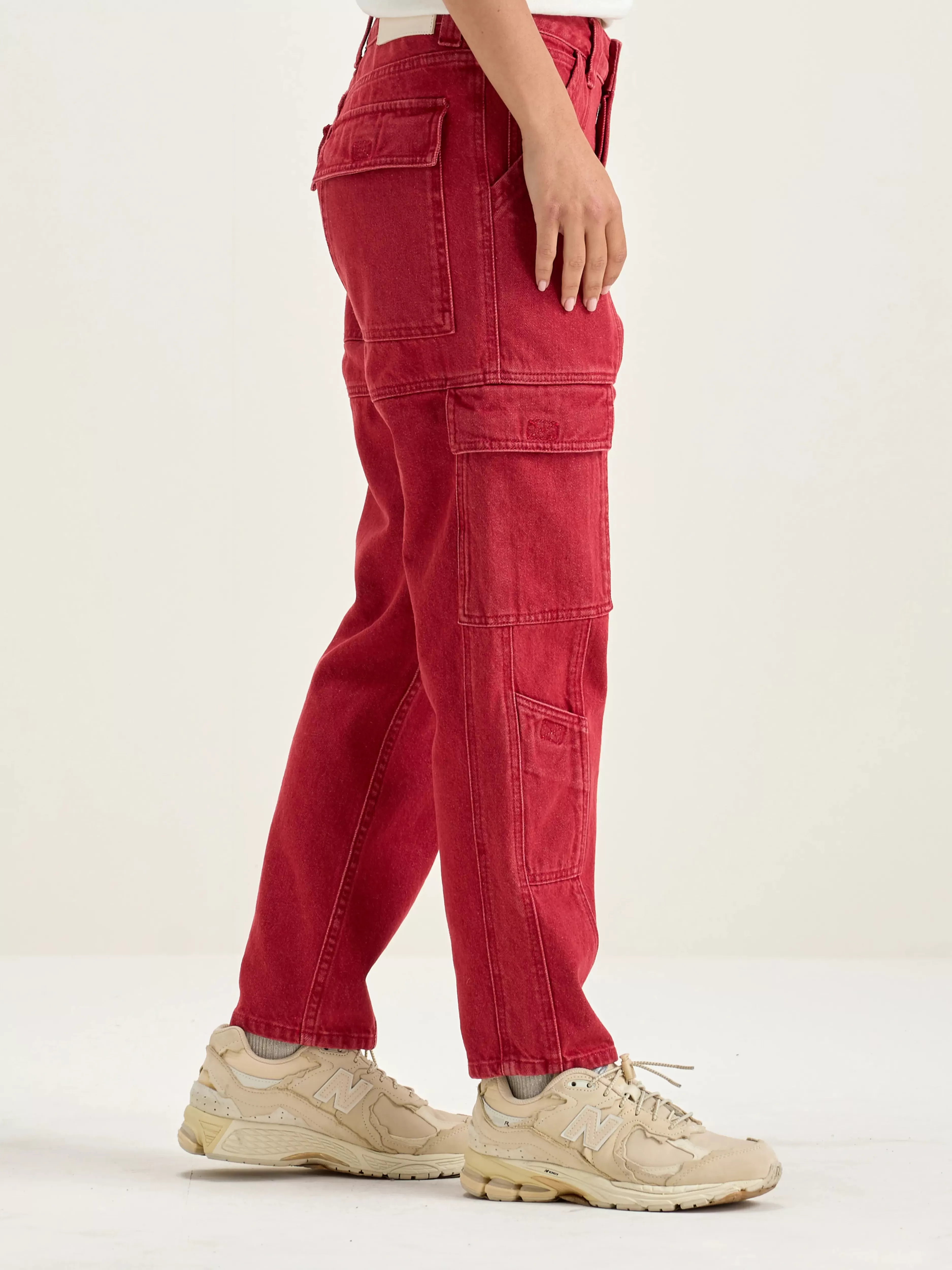 Aansluitende, wijnrode high-waist cargobroek met extra zakken.