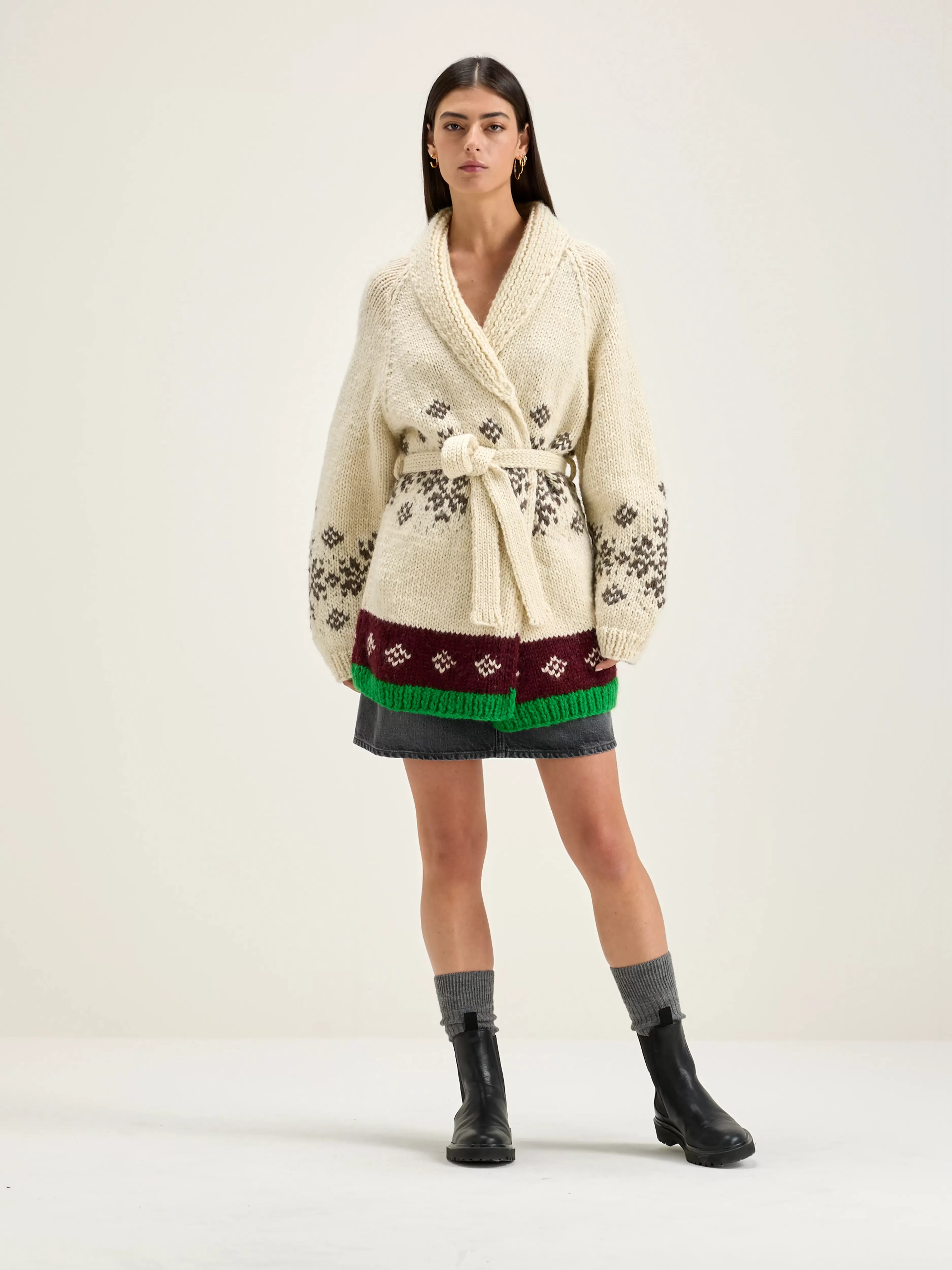 Lange gebreide wollen jas met een lange riem en jacquard motief.SjaalkraagRaglanmouwenBijpassende riemJacquardmotief ond…