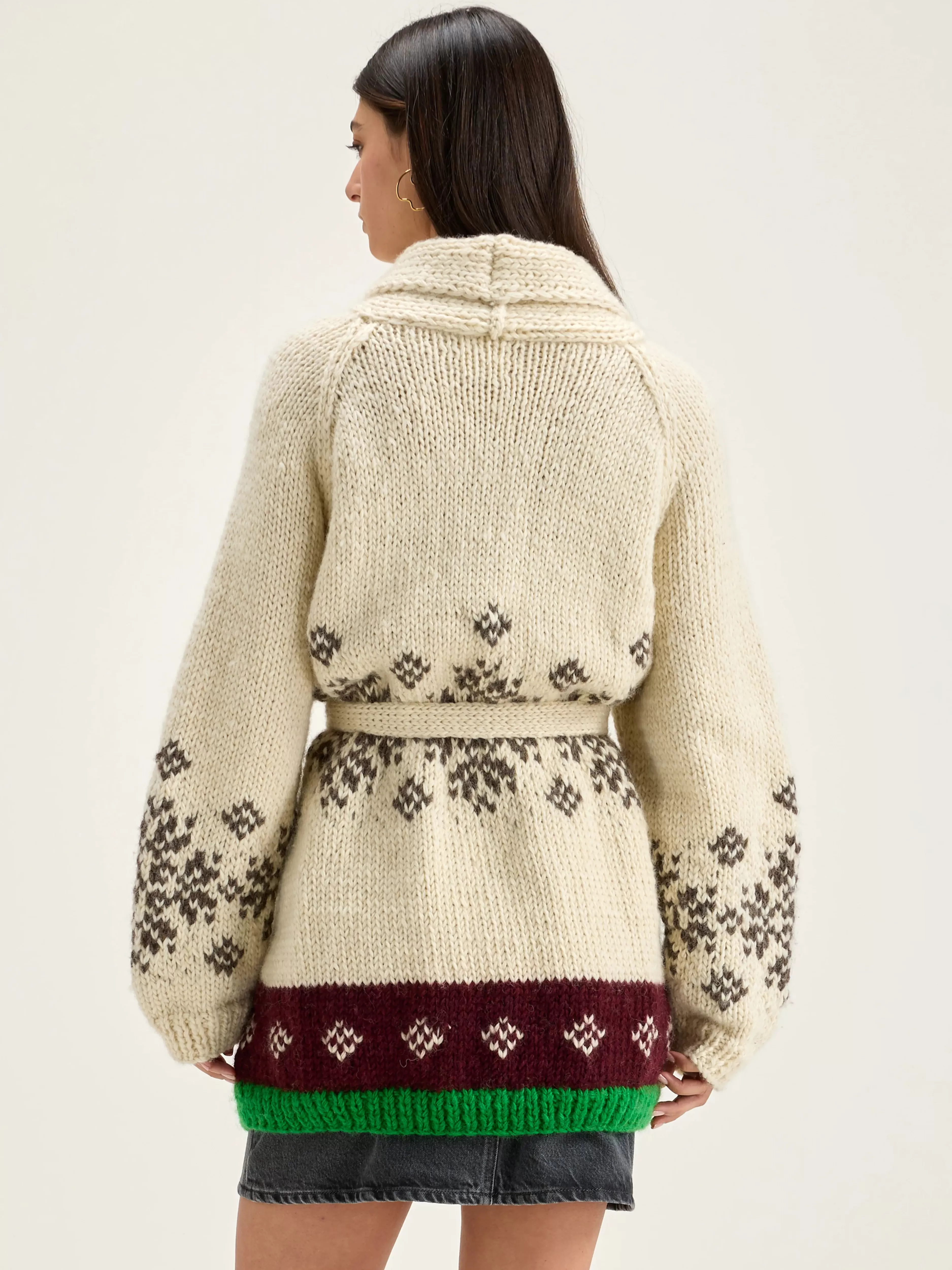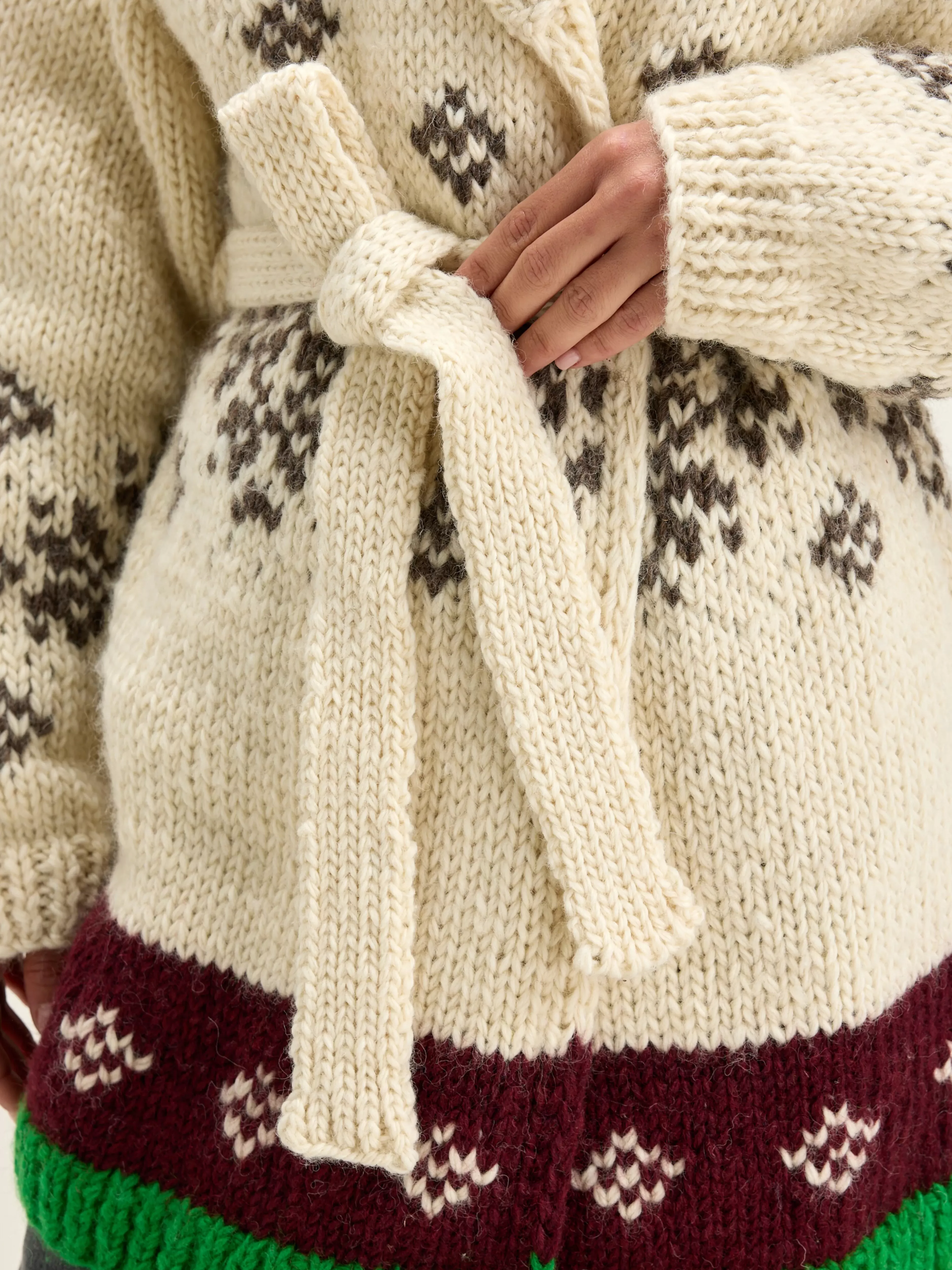 Lange gebreide wollen jas met een lange riem en jacquard motief.