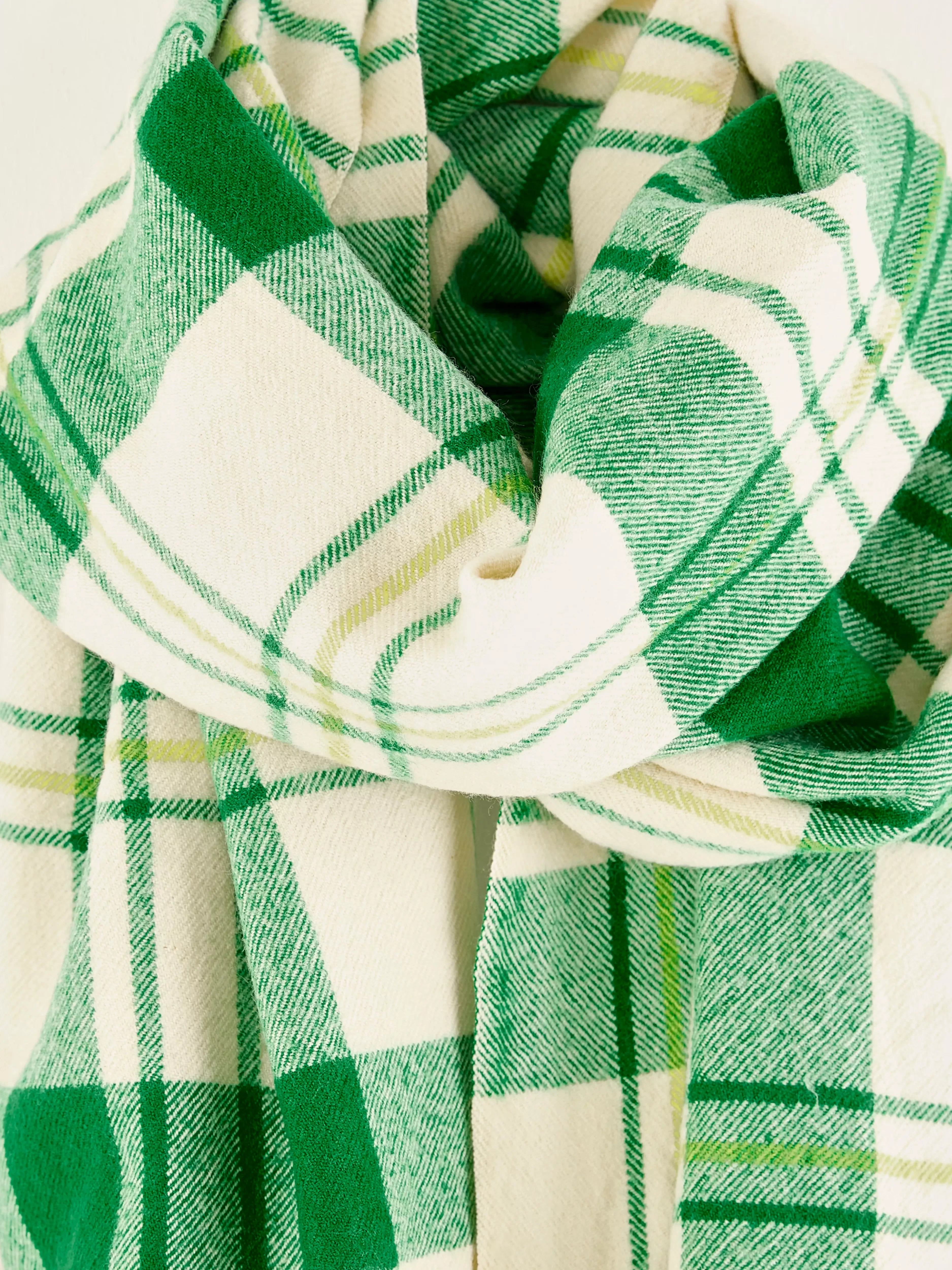 Klassiek geweven wollen sjaal met lichtbeige en groene ruiten.