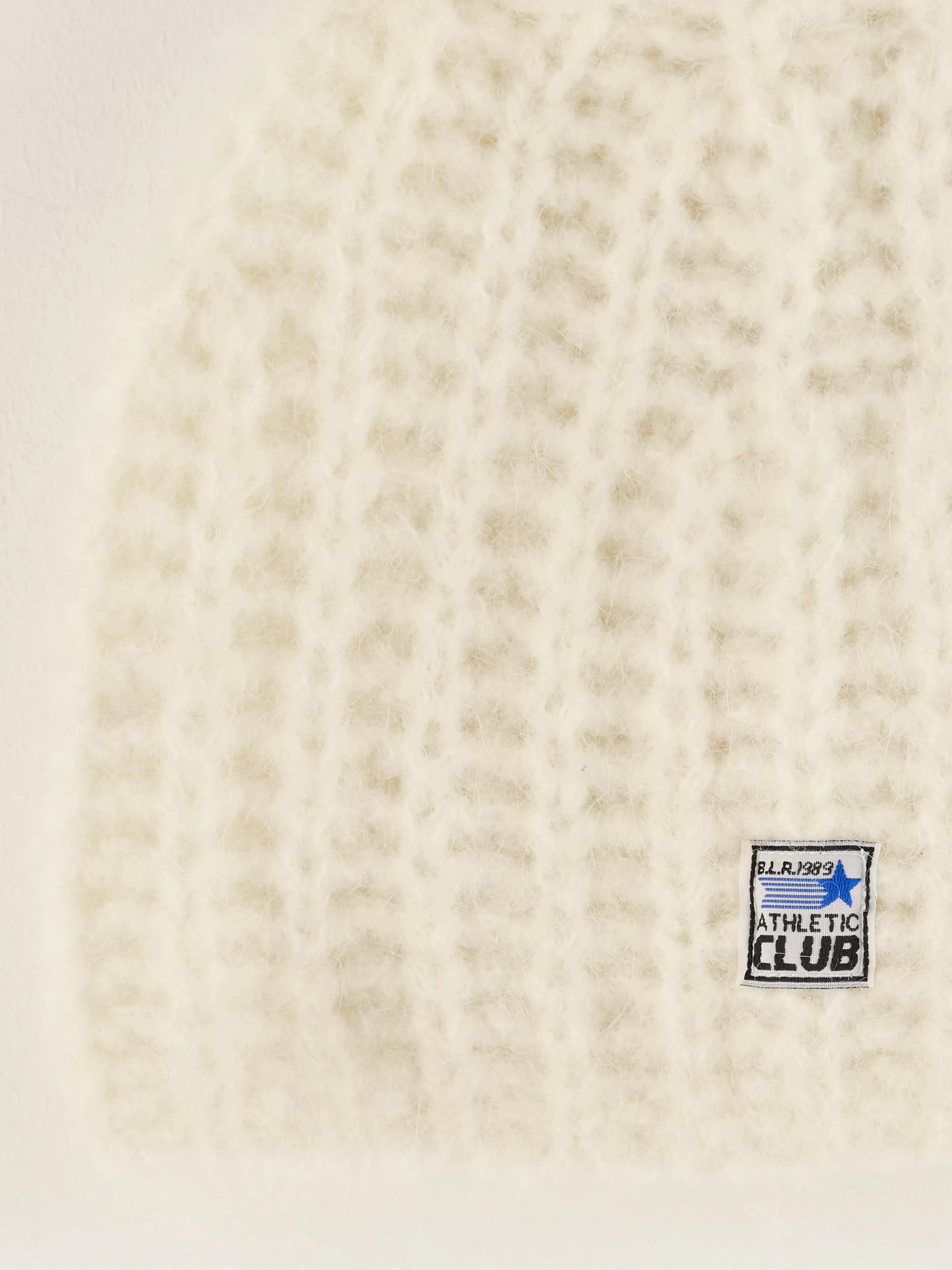 Gebreide beanie met label van de BLR Athletic Club.RibtricotOne size fits allHoogte: 23 cm