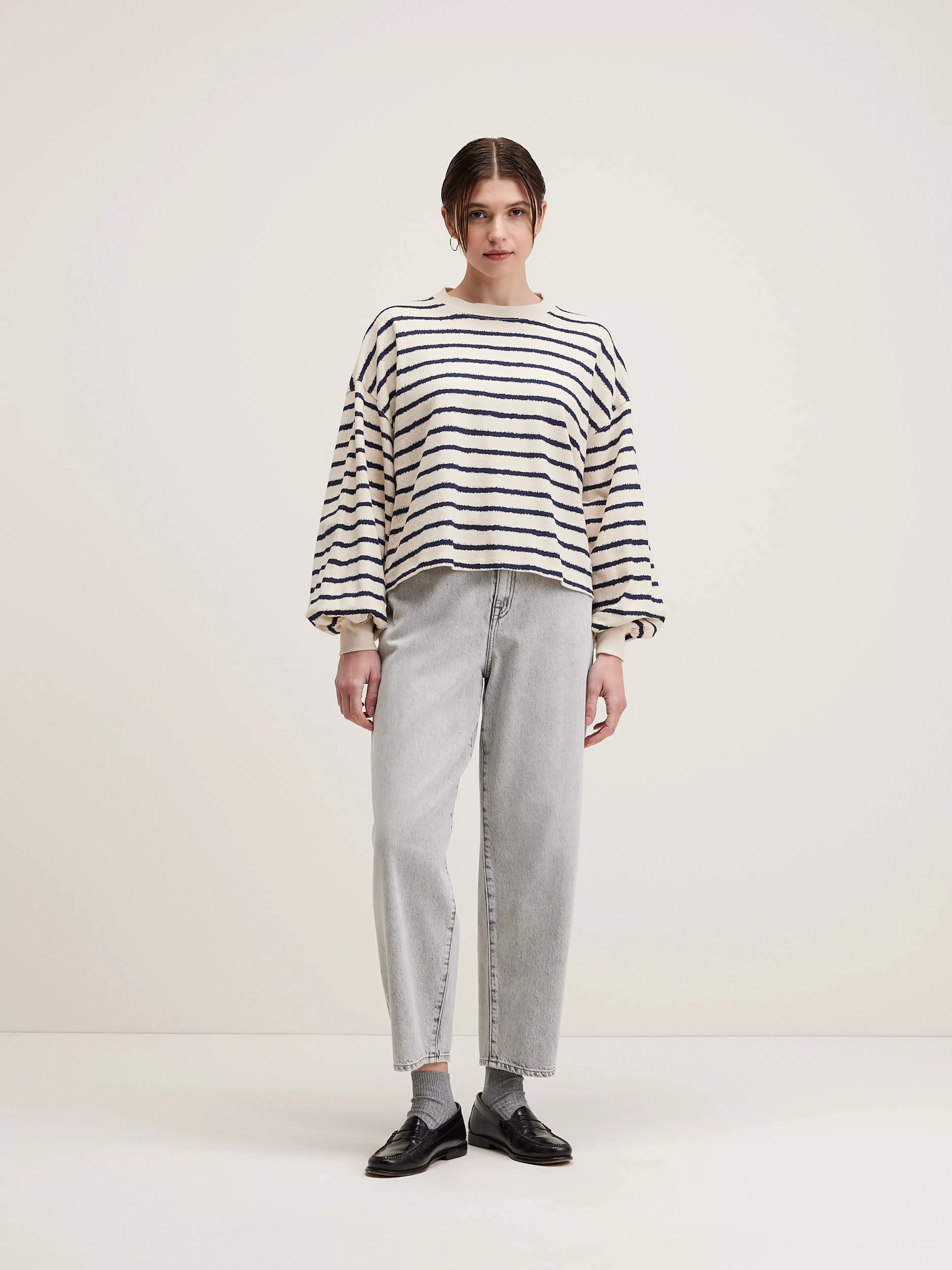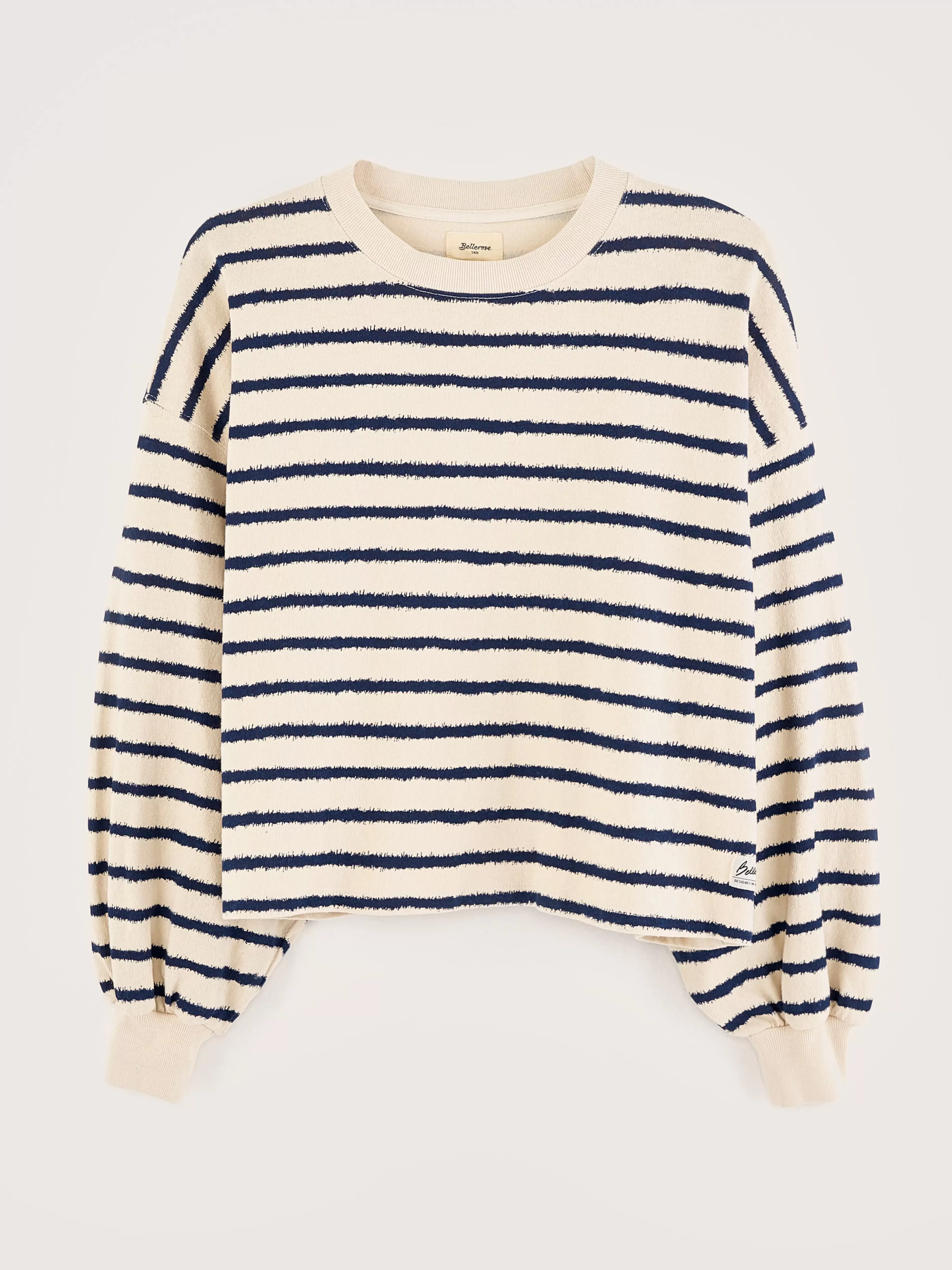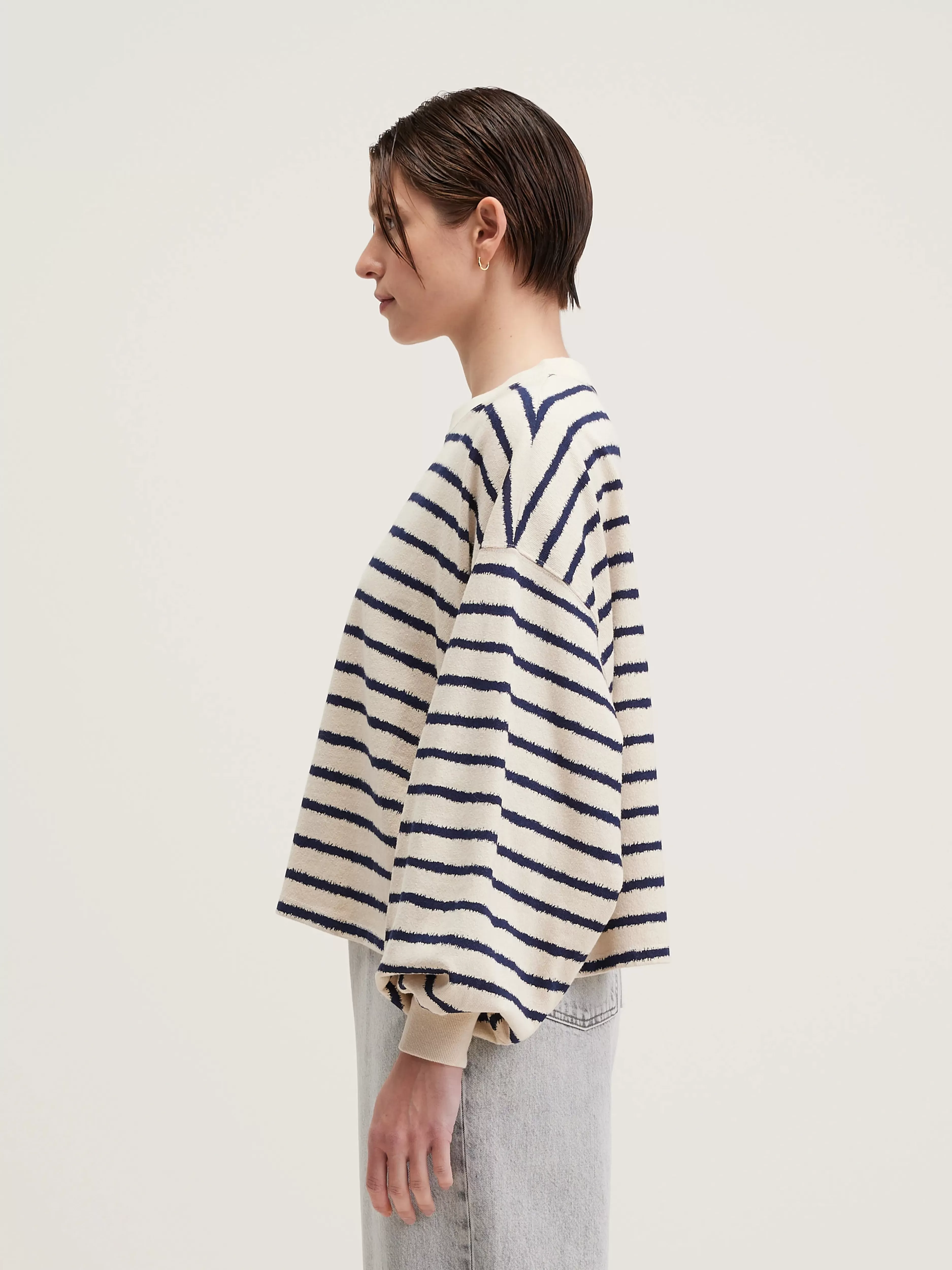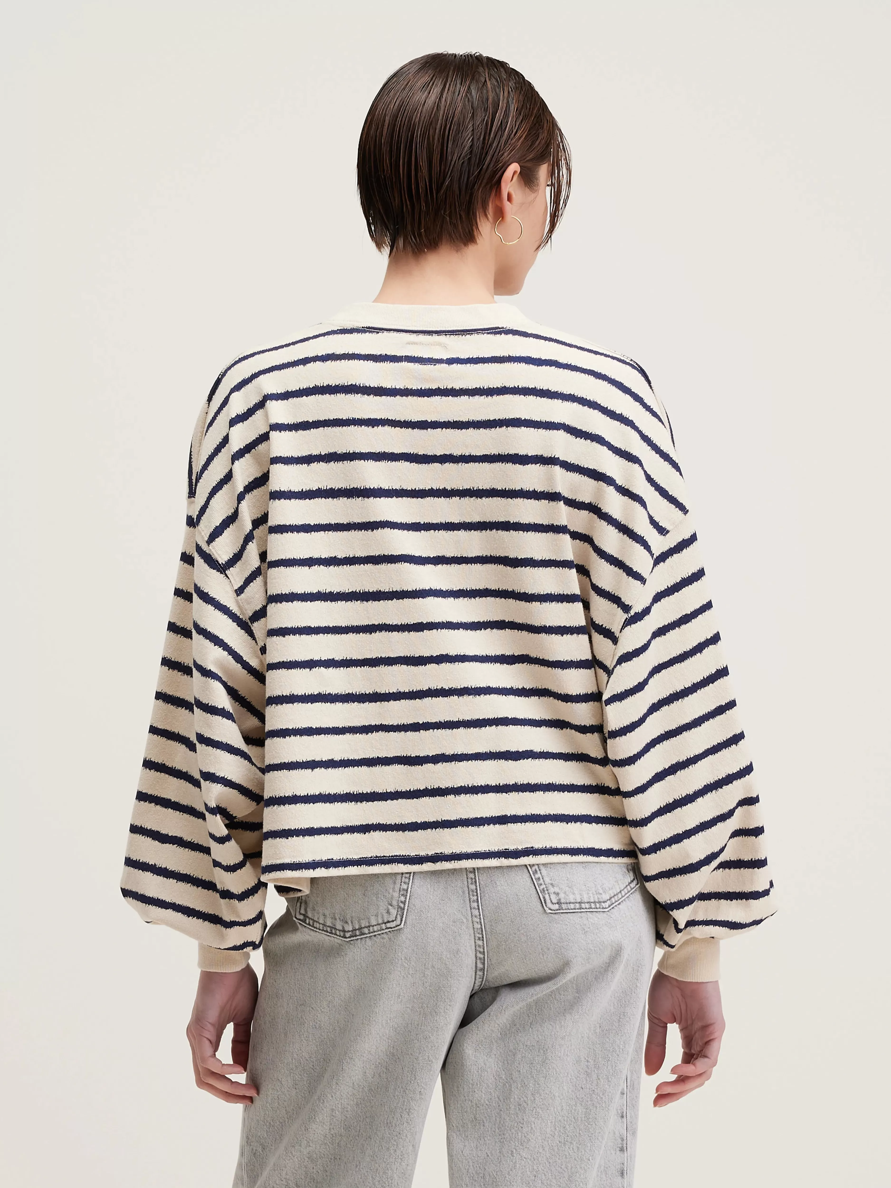 Oversized katoenen T-shirt met lange mouwen en zinderende matrozenstrepen.Oversized cropped fitBisschopsmouwen met aansl…