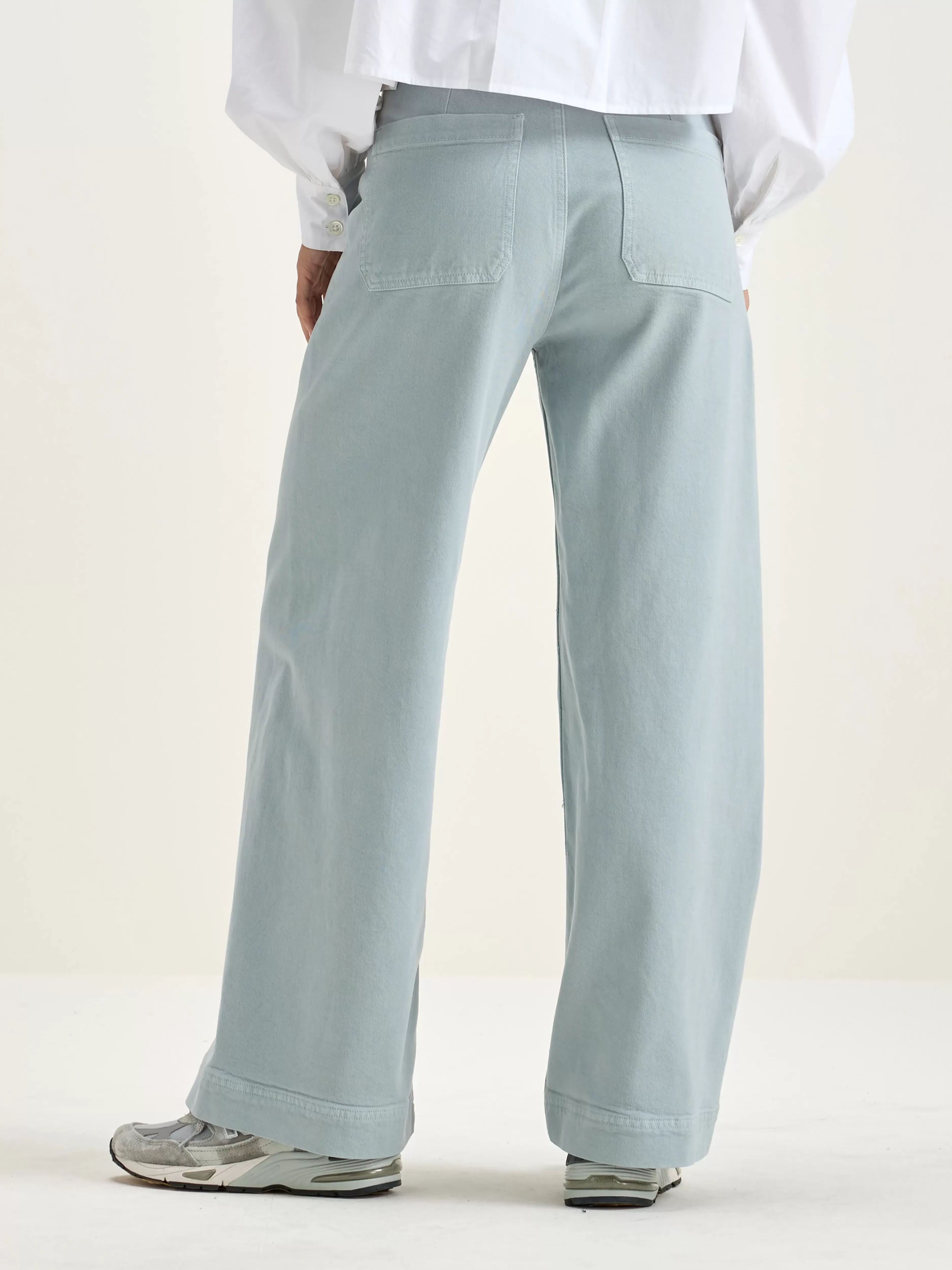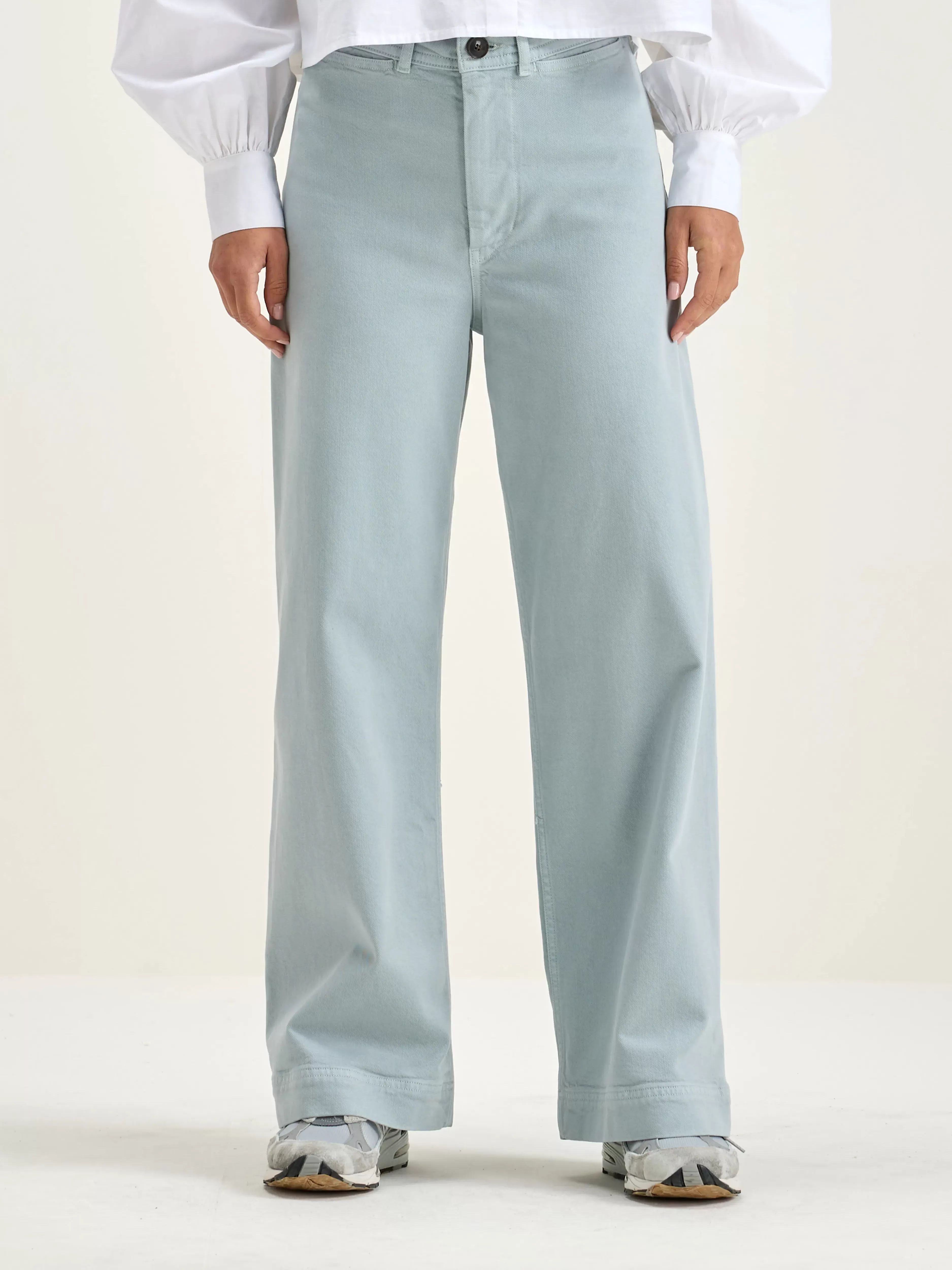 High-waist broek van grijze keperstof, met wijde pijpen.