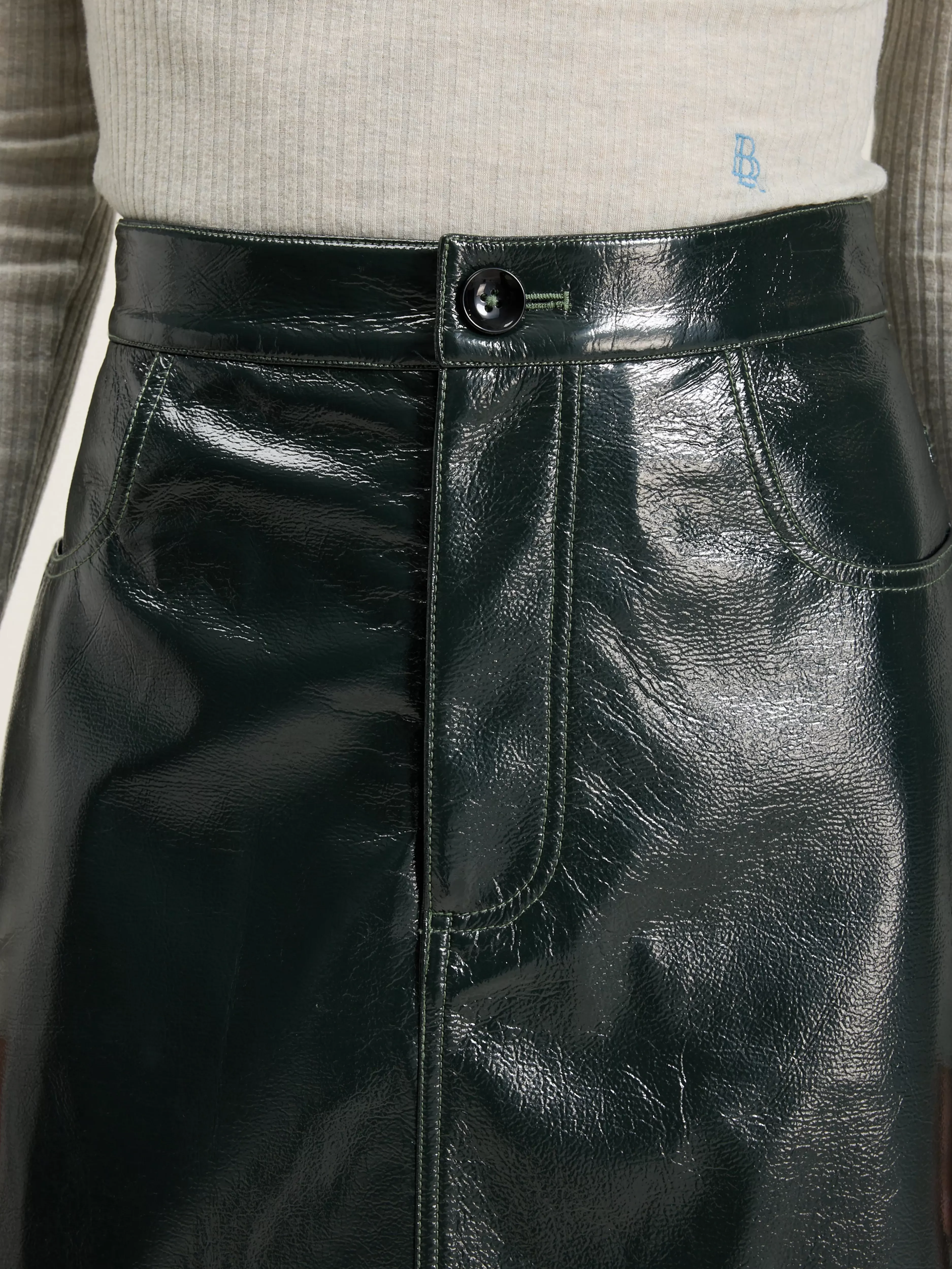 Grijs, trapeziumvormige minirok in five-pocketstijl, van imitatieleer.