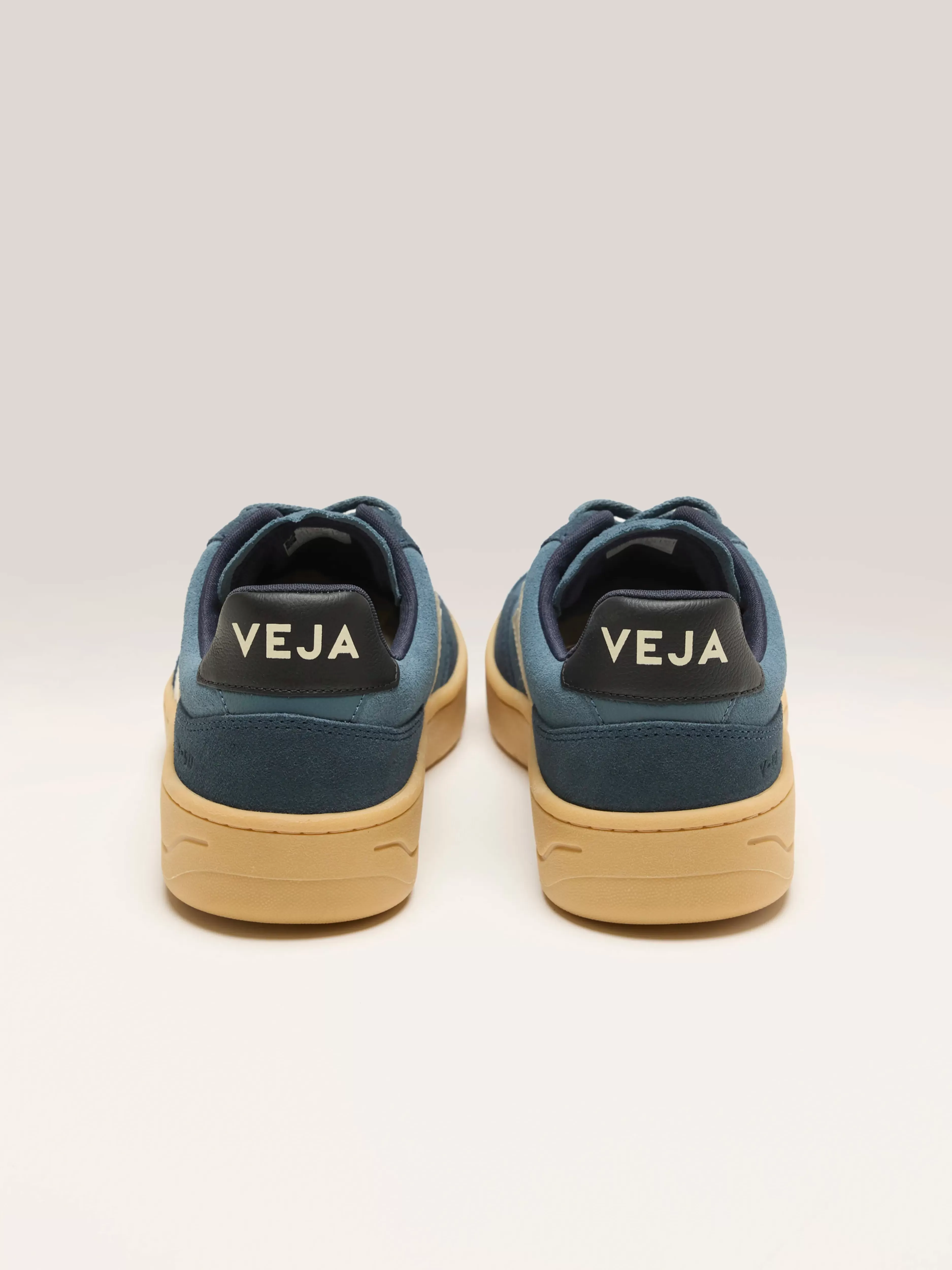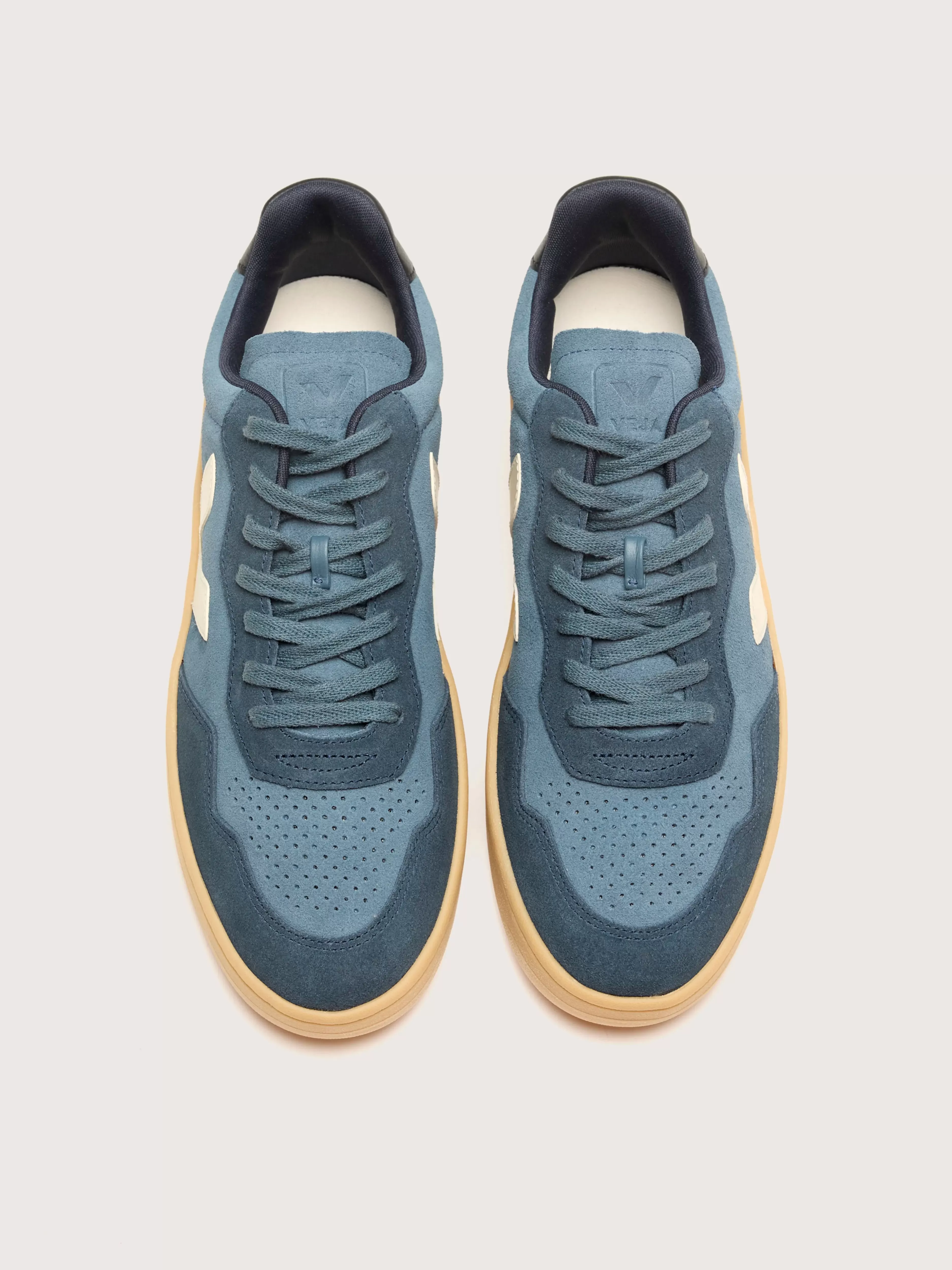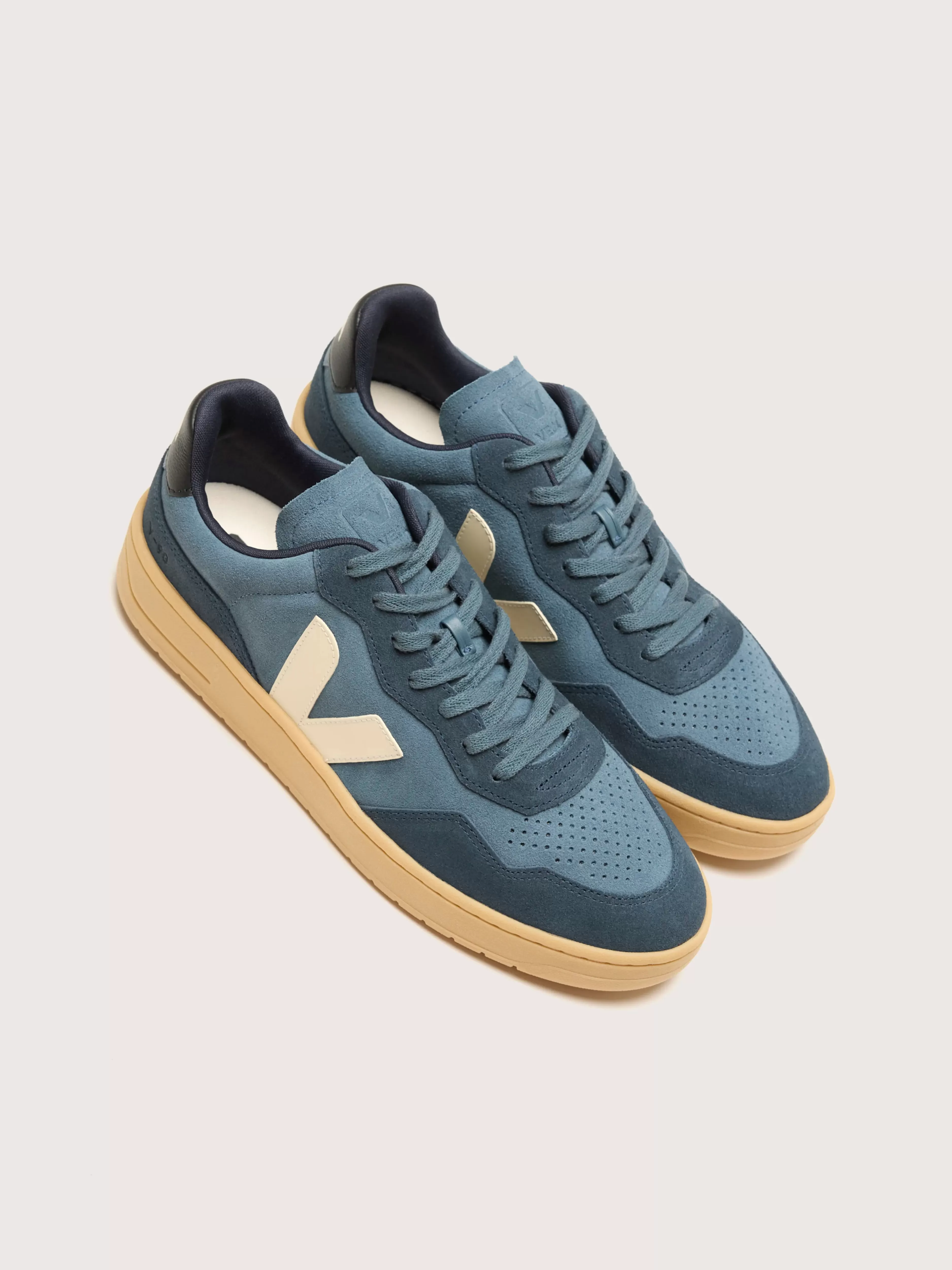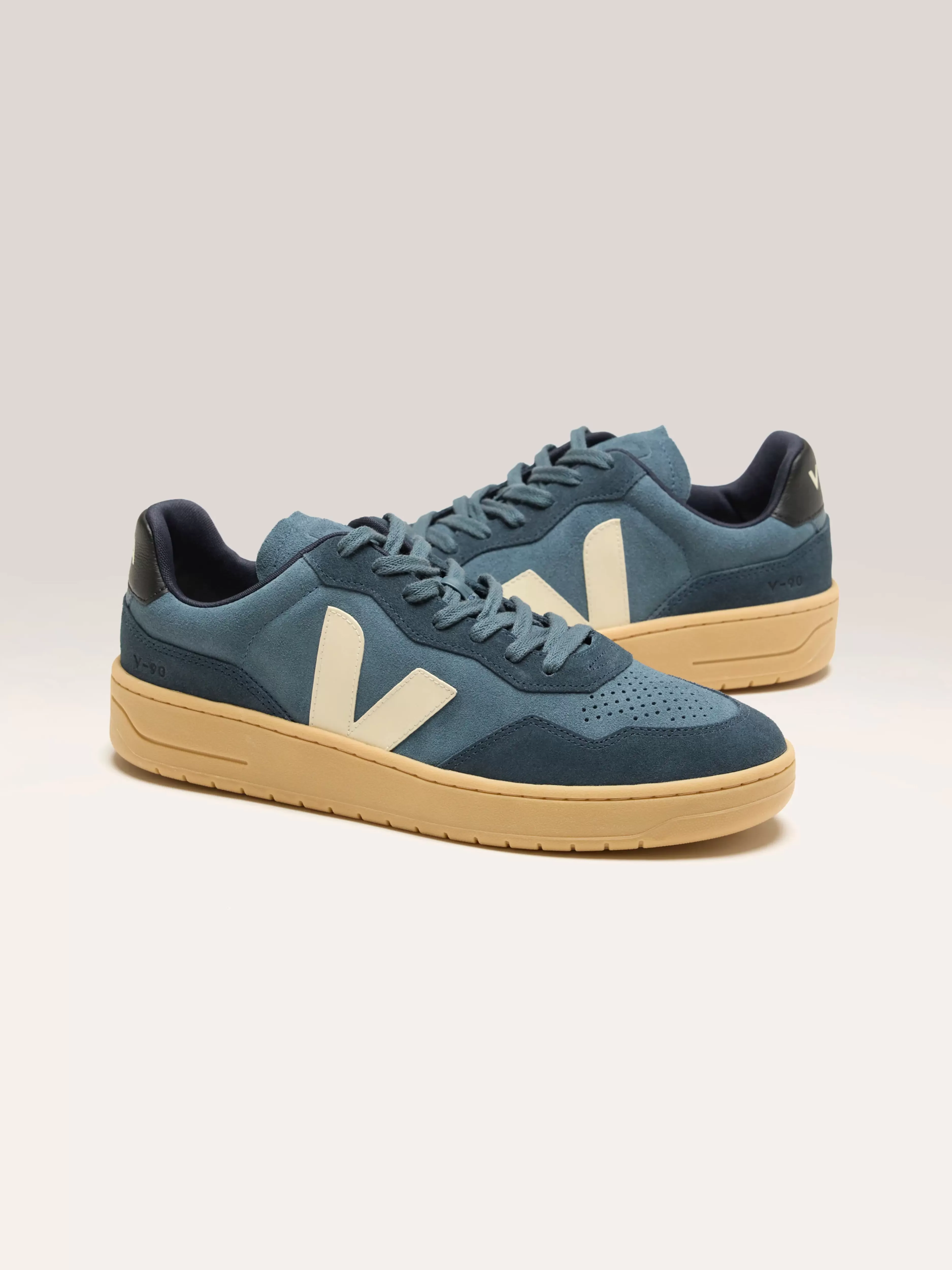 The Veja V-90 sneakers feature a suede upper with Amazonian rubber soles in an eco-friendly design.