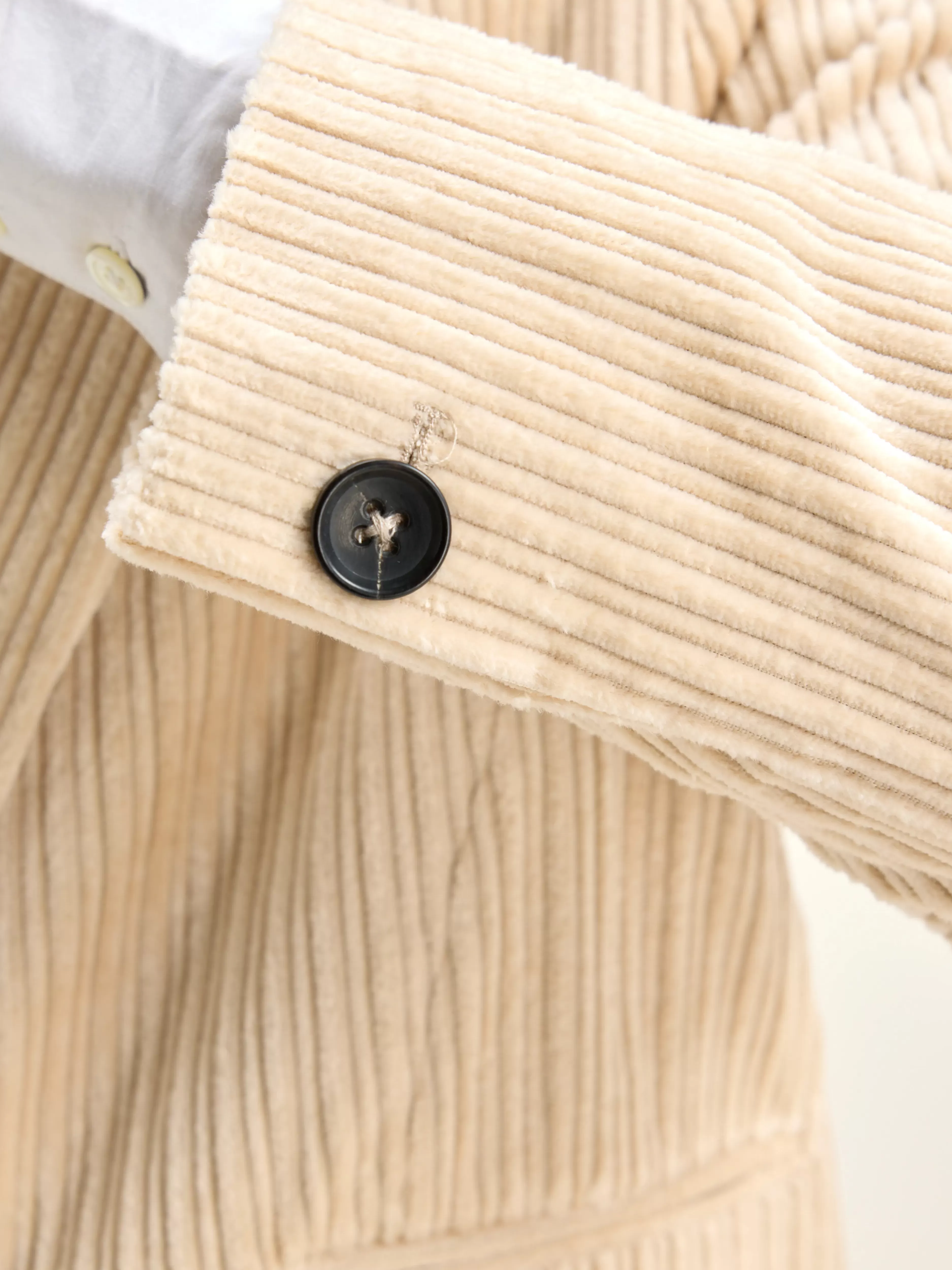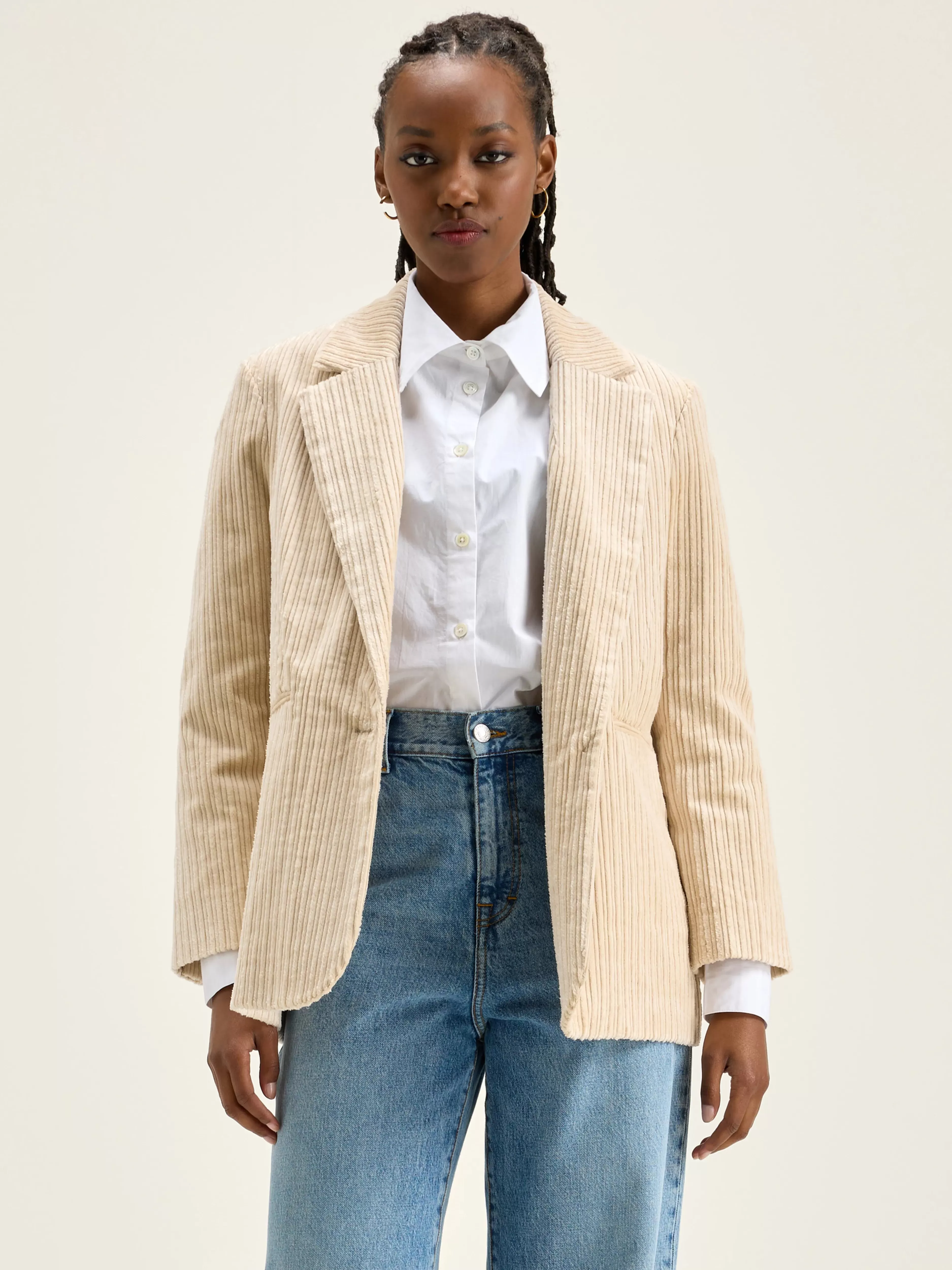 Klassieke ecru blazer met relaxed model, van corduroy met onregelmatige brede rib.Diepe reverskraagSluiting met één kn…