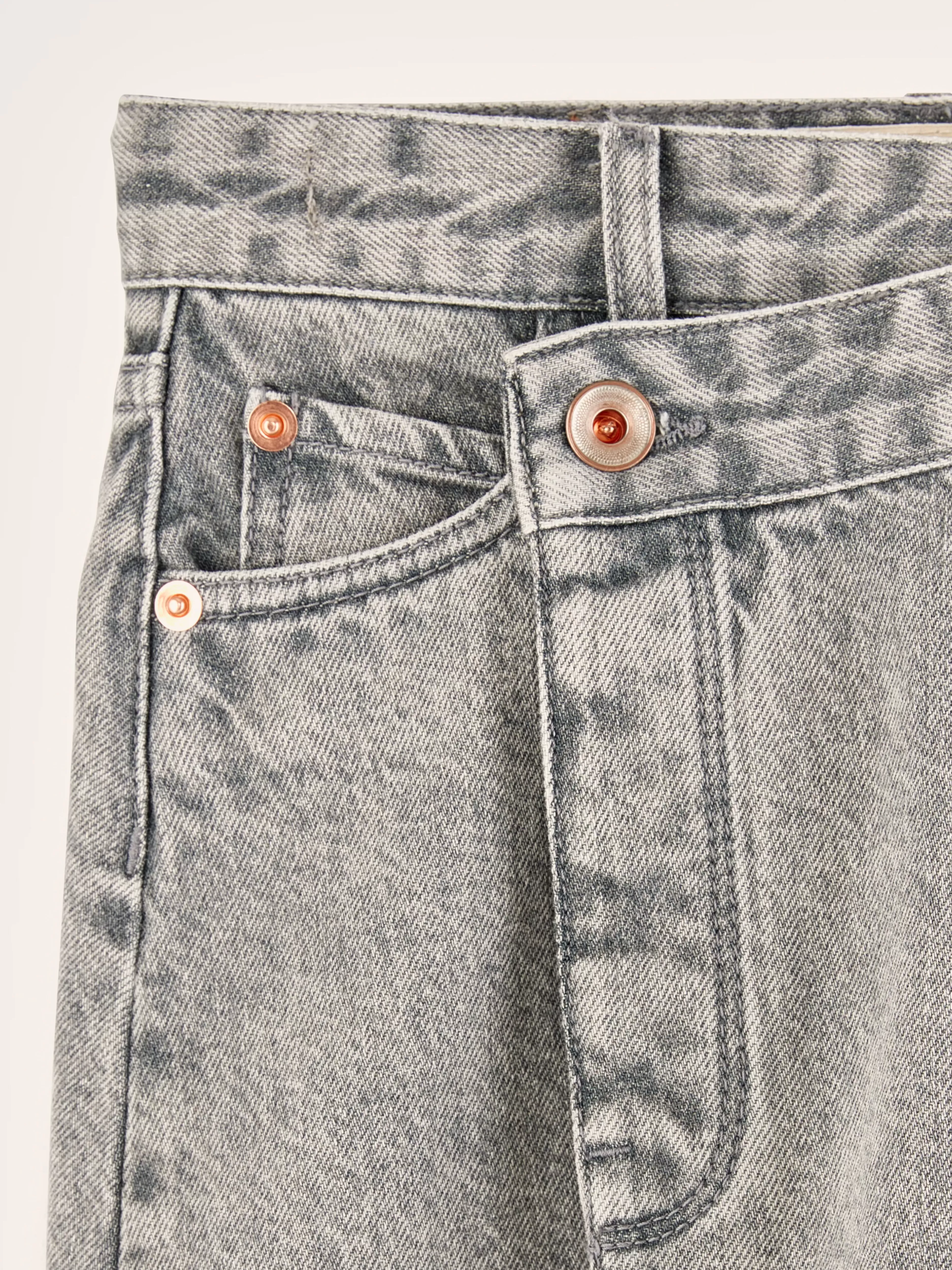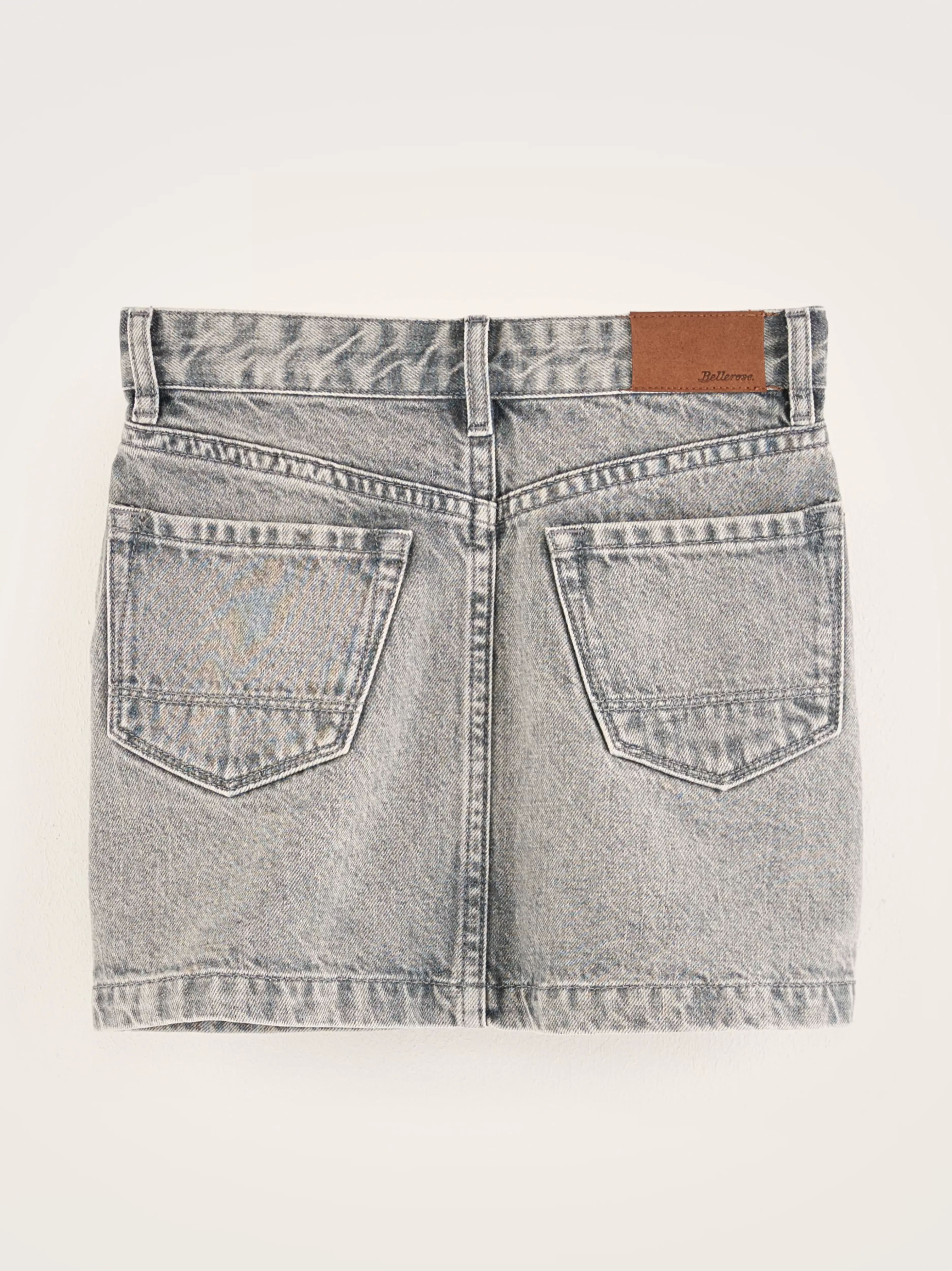 Mini-wikkelrok van grijs stone denim.WikkelrokstijlFive pocket stijlOverlappende zijknopenRiemlussen
